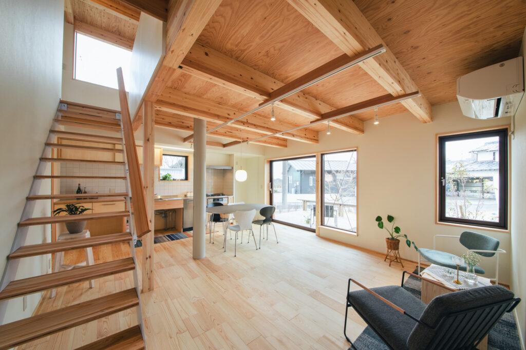 集成材は反りや割れが起きにくく、色合いも明るいため、aisuの家が大切にする「自然とすっきり暮らす」というコンセプトにも調和します。