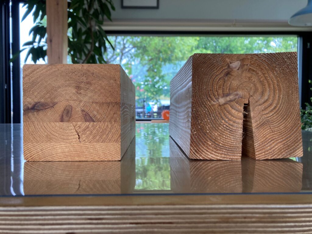 左:集成材(レッドウッド) 右:無垢材(杉)