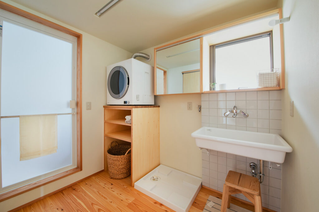 今回ご紹介するaisuの家では、基本形のままLDKにゆとりをもたせるために、お風呂と洗面を2階にあげる設計を取り入れています。